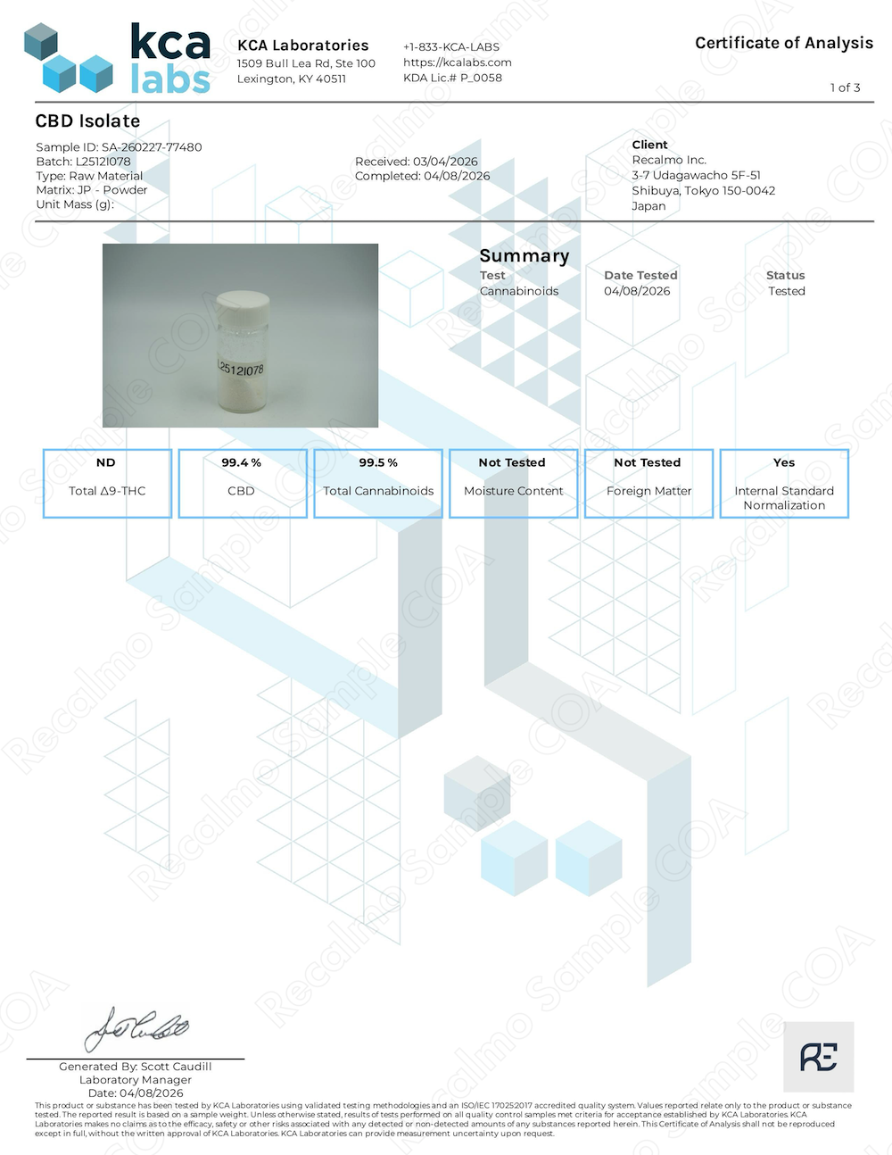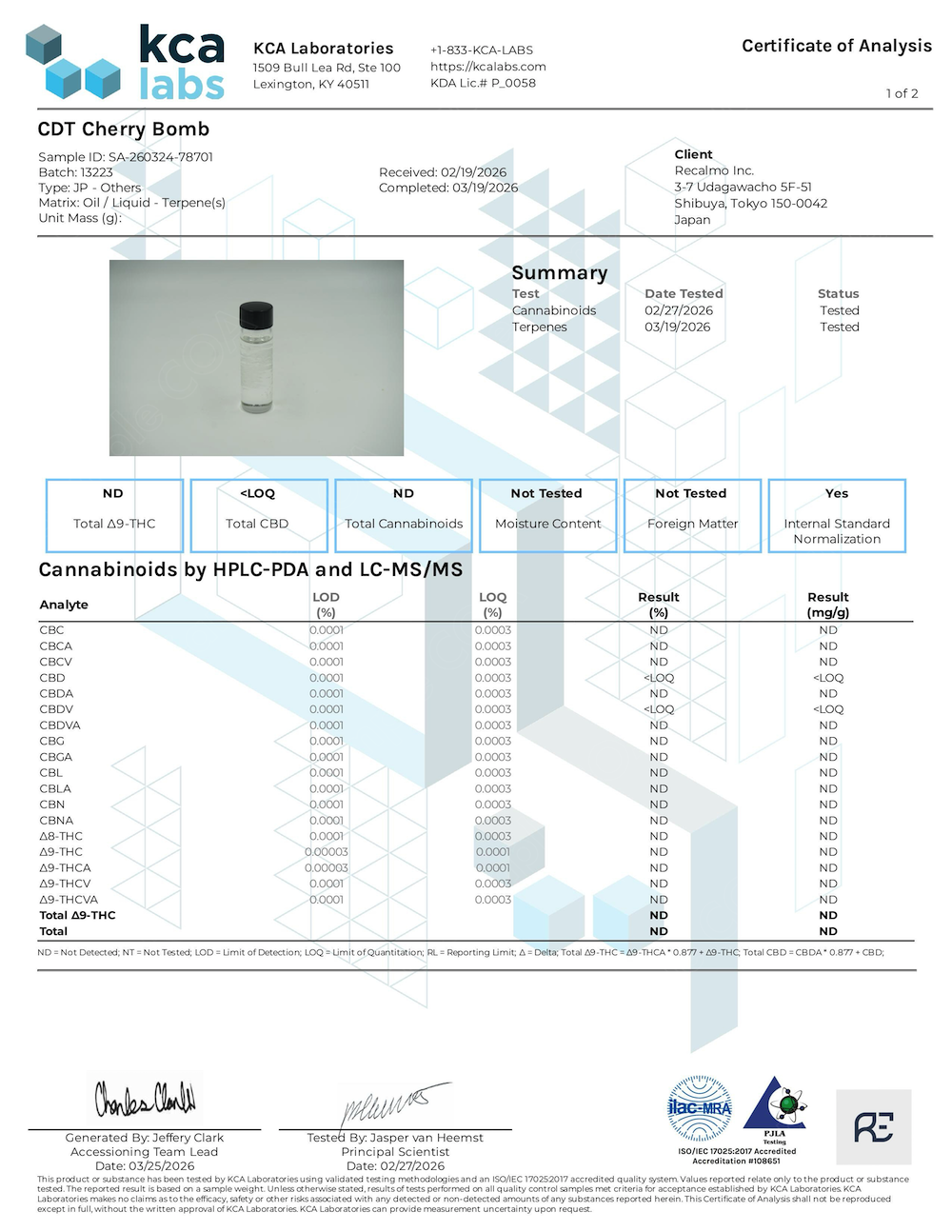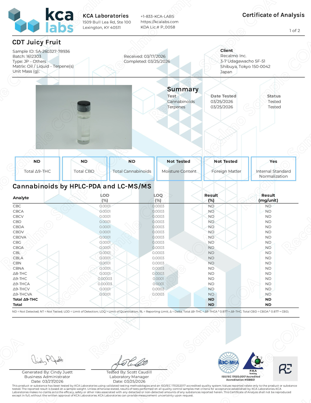 COA(成分分析表) 全て (12)粉末 (5)油脂 (4)香料 (3)Loading...CBDアイソレート (KCA-1)CBDアイソレート (KCA-2)CBNアイソレート (KCA-1)CBNアイソレート (KCA-2)CBGアイソレート (KCA)CBG-CRDオイル (KCA)CBG-CRDオイル (Anresco)H4CBD (KCA)H4CBD (KCA)CDTテルペン - マンダリンクッシュ (KCA)CDTテルペン - チェリーボム (KCA)CDTテルペン - ジューシーフルーツ (KCA)