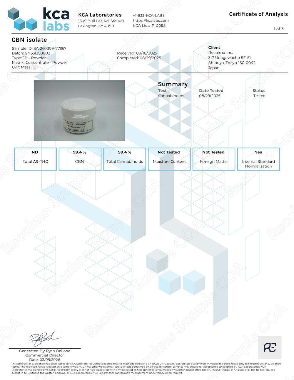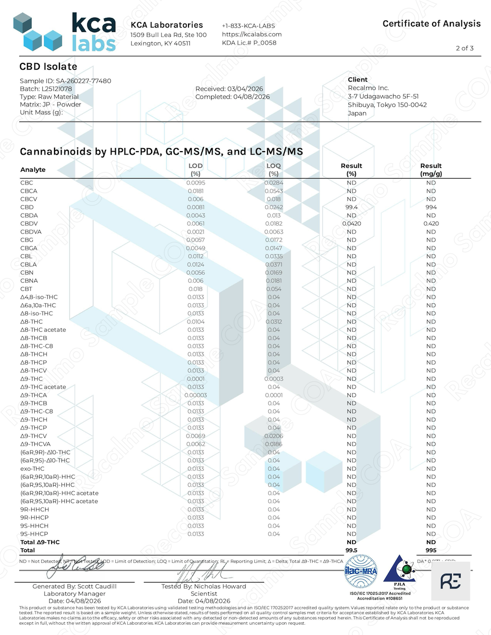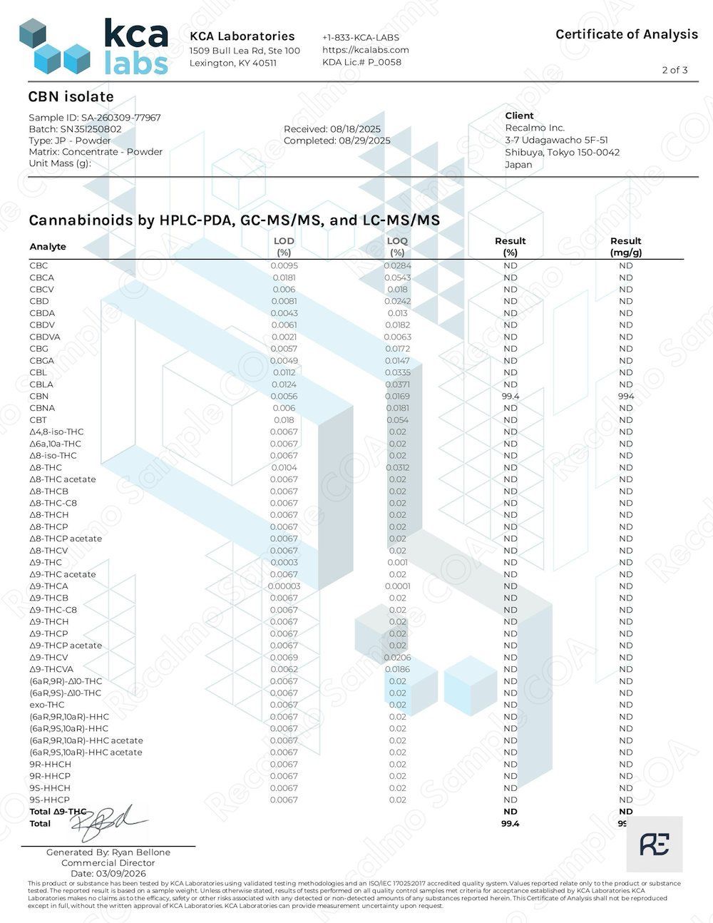COA(成分分析表) 全て (12)粉末 (5)油脂 (4)香料 (3)Loading...CBDアイソレート (KCA-1)CBDアイソレート (KCA-2)CBNアイソレート (KCA-1)CBNアイソレート (KCA-2)CBGアイソレート (KCA)CBG-CRDオイル (KCA)CBG-CRDオイル (Anresco)H4CBD (KCA)H4CBD (KCA)CDTテルペン - マンダリンクッシュ (KCA)CDTテルペン - チェリーボム (KCA)CDTテルペン - ジューシーフルーツ (KCA)